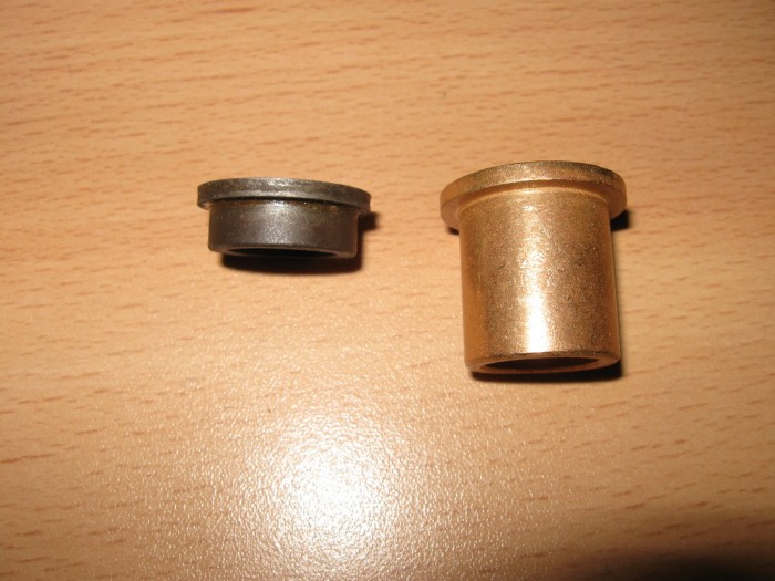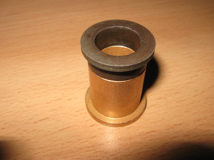 Bon j'ai reçu les bagues à collerette en bronze autolubrifiant qui vont au niveau du bras oscillant. Le hic c'est qu'il va falloir les retoucher, elles sont trop longues de 18mm (les neuves)  :/  La collerette a un diamètre légèrement supérieur à celles d'origine mais la ça ne gênera pas... Va falloir la jouer fine, pas question de serrer les bagues en bronze dans un étau pour couper à la scie à métaux... On va dremeliser...
