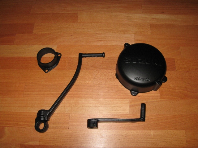 Peinture HT 800° pour la sortie d'échappement du cylindre et peinture carrossier noire satinée pour les autres pièces.