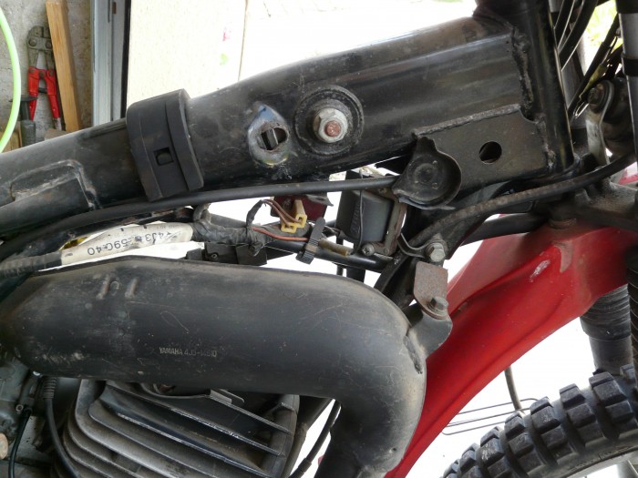 sur la photo la fixation a été remise en position d'origine mais on voit bien le point d'ancrage enduro ovalisé.