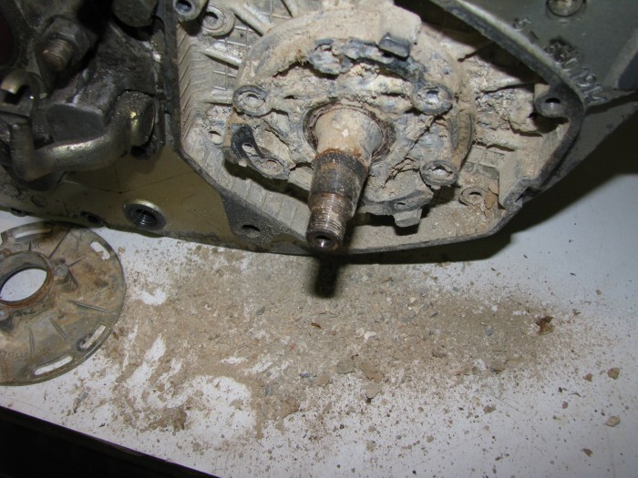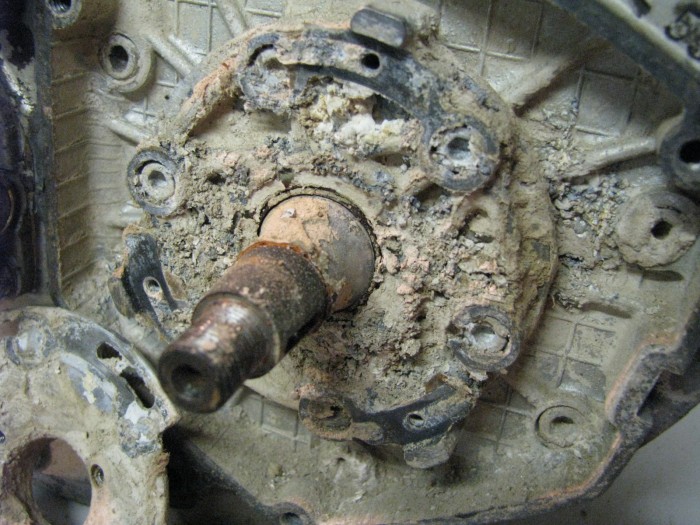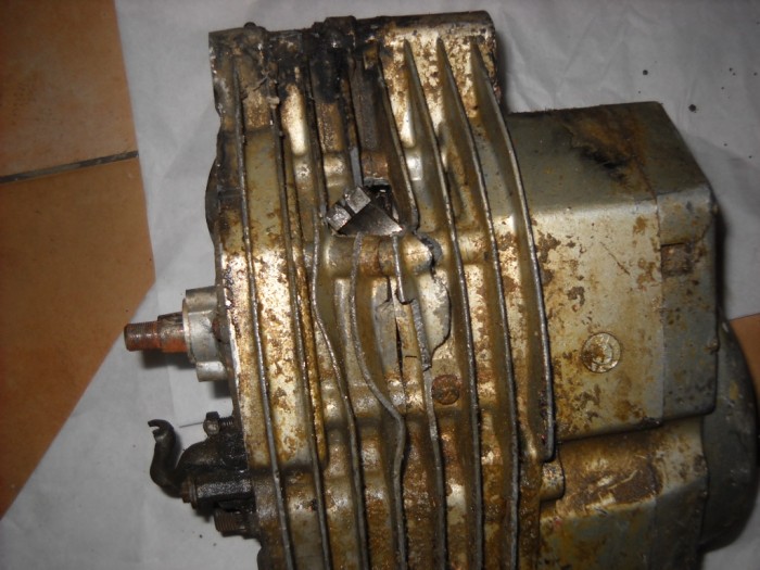 Ouaich  😳  😳  😳  😳  .....mauvaise surprise au démontage hein!!! TOUT est bloqué par la boue et la rouille!!! va y'avoir du taf pour le faire redémarrer celui là!!!! mais bon, je vais pas me laisser abattre pour si peu....la boite, l'embrayage et les carters malgré leur gangue de boue séchée sont nickels. Tout le reste est à reprendre et notamment la bielle quelque peu grippée comme le montre la masse posée en équilibre....ça tourne pas chef!!!