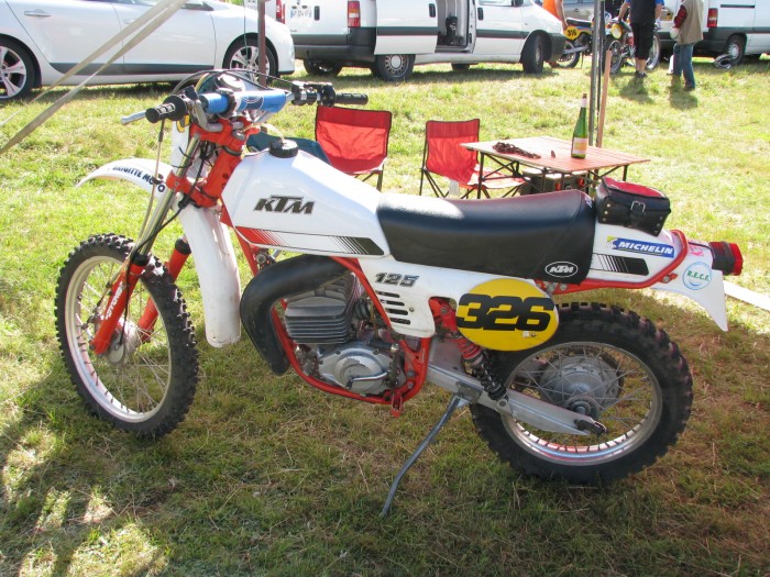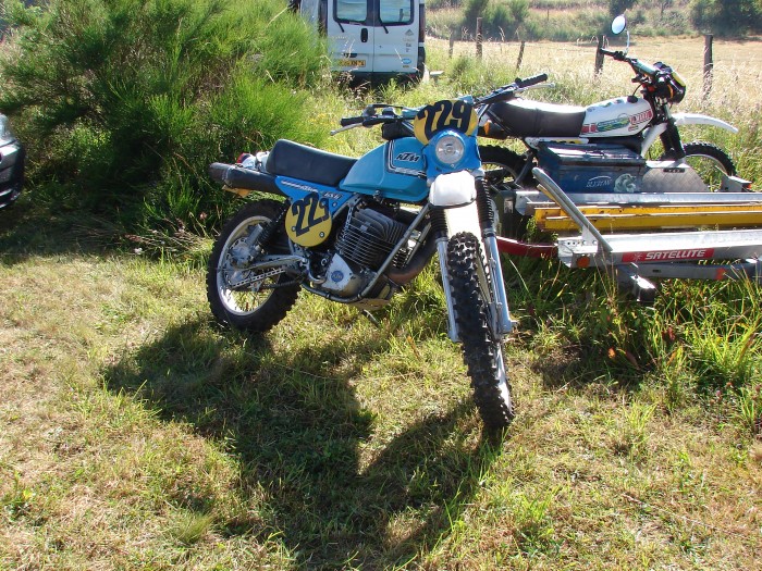 Au passage mon Ticfan préféré m’apporte ma nouvelle copine a restaurer, une superbe 125 KTM GSPL83 dans son jus qu’il m’avait mise de coté depuis près de 2 ans et qui se trouve être dans un état de fraicheur étonnant pour une moto de presque 30 ans  😍  😍  😍   . Elle n’avait pas démarré depuis longtemps, mais elle était stockée au sec et comme ça, juste pour le fun, je prélève deux verres de mélange dans ma 240 et le verse dans le réservoir. Je remplis la durite de carbu de la 125, je bascule le starter et deux coup de kick après, elle tournait gentiment au ralenti….bon, j’y croyais pas trop, mais en même temps, c’est une katé hein…  👍  .Le fiston du frangin me demande s’il pourra rouler un jour dessus et je sens bien que du haut de ses 12 ans, le virus de l’enduro rétro l’a chopé le gamin ! 👍
