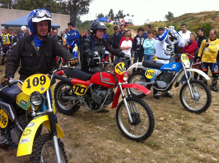Je filme à tout va, photographie de temps à autres, m’extasie devant le pilotage incisif d’un 80 AIM, je vois passer tous les potes, je suis stupéfait par l’attaque de Poulet avec sa Bul’ qui colle au train d’un 250 PE (quel mérite avec une sélection à droite), j’ai les poils à l’équerre au passage de la Jawa du Homard, milladiou, quel moteur !!, le Planplan sauteur saute, le Gégé Monark ouvre grand, le père Vellas emmanche comme un fou, propre et net comme à sa bonne habitude, le Flamby passe en chantant sous son casque (j’ai cru entendre « la p’tite Huguette tripotte moi l’carbu avec les doigts » mais je ne suis pas certain des paroles), je vois passer PoumpoumPidoux, propre, net et sans bavures dans son pilotage et  qui taxe tout le monde, Laurent Pellegry avec sa japoniaiserie qui roule très vite et très efficacement. 😀  😀