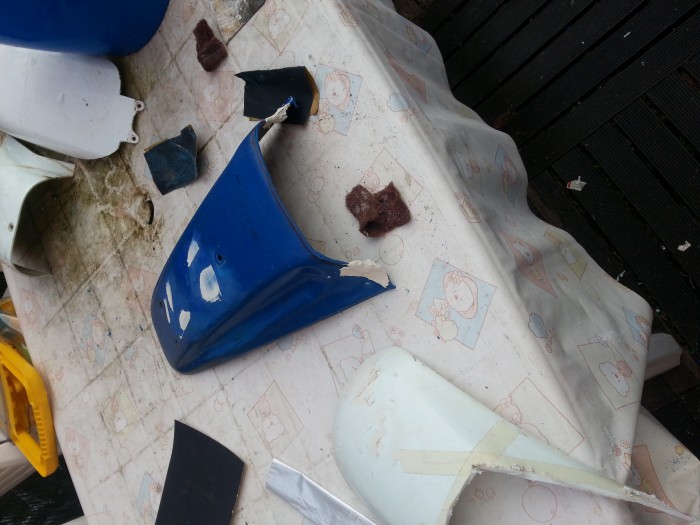 Ayant fait le tour de la bete, je me suis dit que j'avais quand meme la bulle de phare avant à changer.. ( cette derniere ne me plaisait pas vraiment je vais poster quelque photo...) et une chose en entrainant une autre evidement.. j'ai fini avec le moteur sur la table du jardin, le cadre de l'autre coté et diverse pièces par ci par là 🙂 bref en pièce détachée !!
