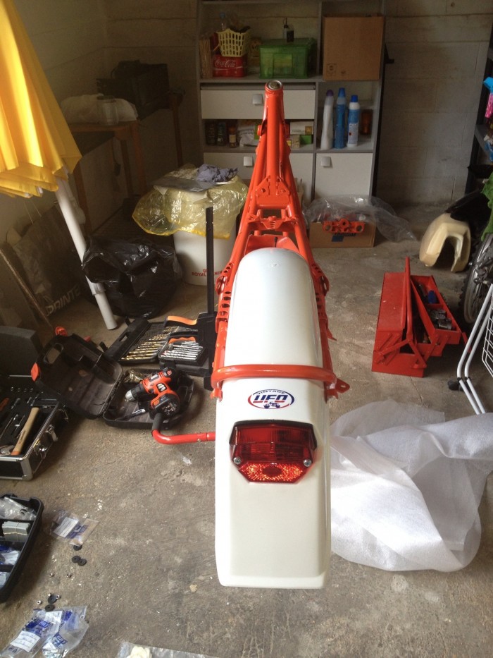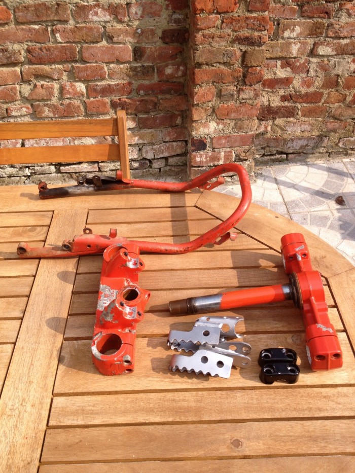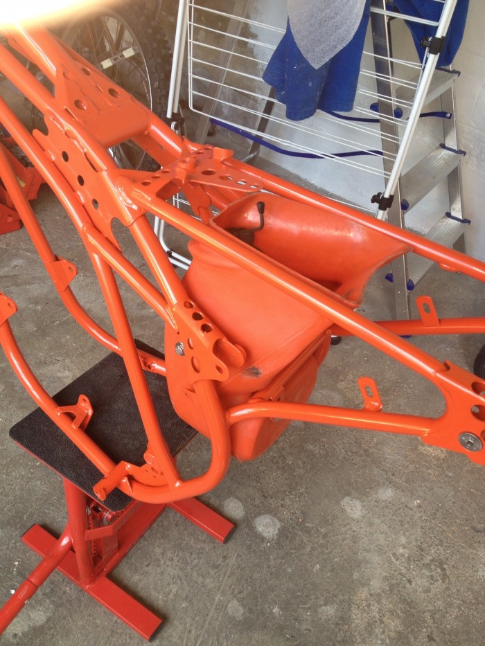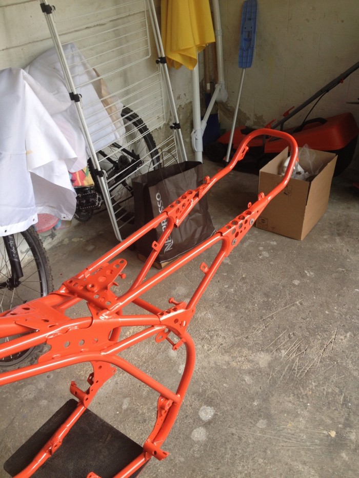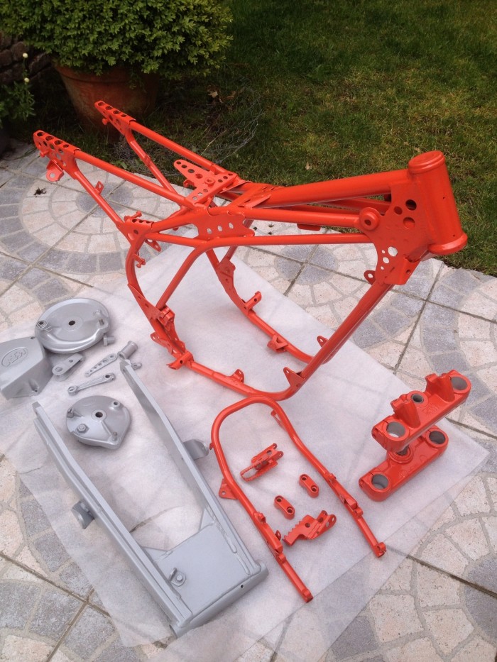 J'ai enfin reçu cadre et accessoires de retour de peinture époxy, merci à FR Coating à Hazebrouck qui a fait un super boulot et pour 180 € l'ensemble .