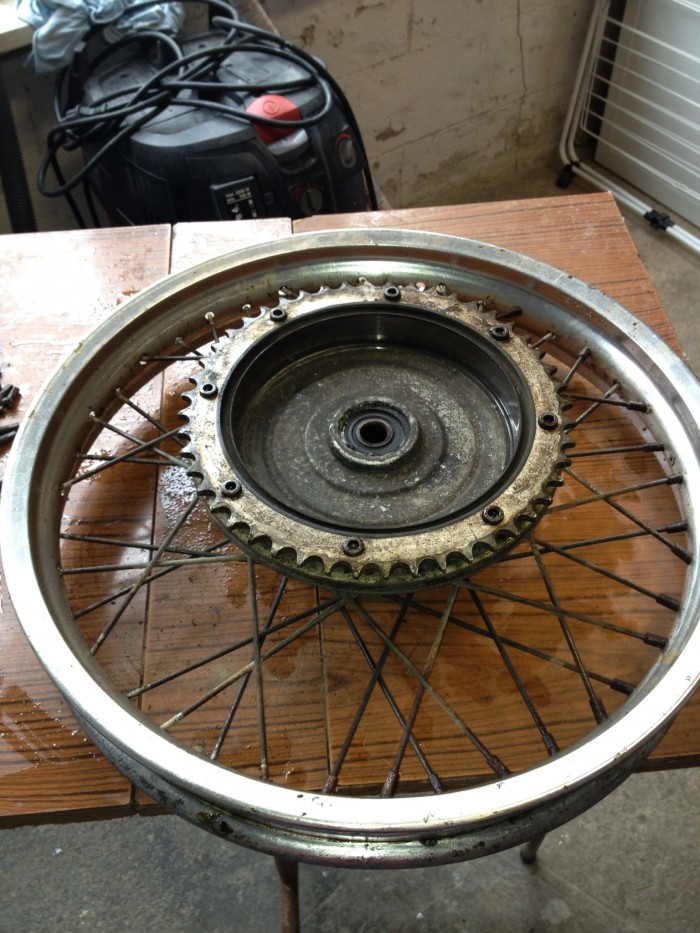 Ensuite démontage des rayons de roue arrière qui seront remplacés par des inoxydables, moyeu sablé et époxy