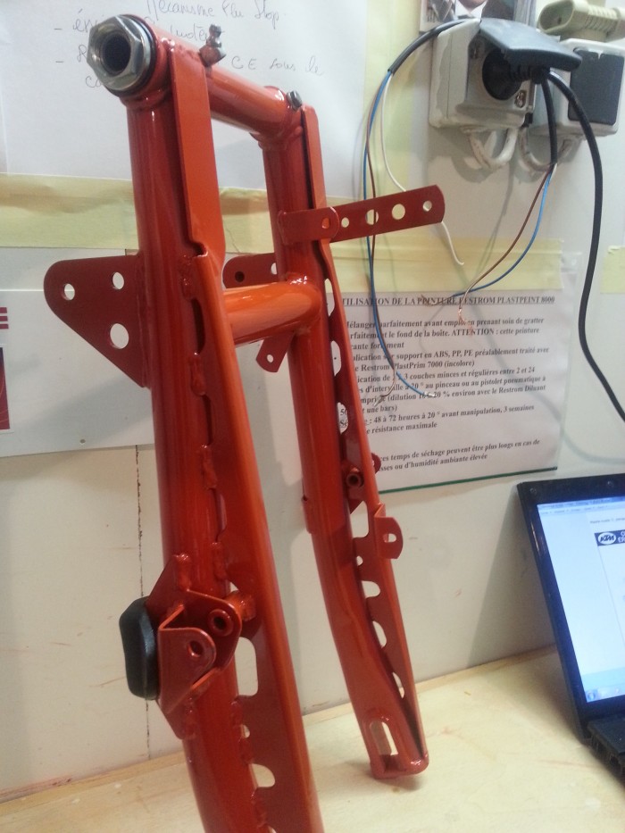 Le lendemain à l'éléphant bleu, deux jetons tout est parti, puis le peintre a mis de l'apprêt et leur peinture RAL 2002, diluant et durcisseur. Cela donne cela.