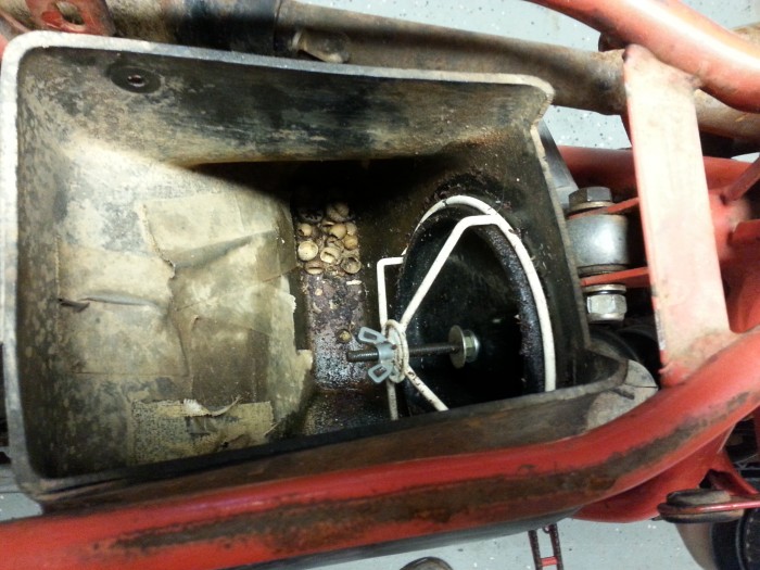 C'est pas le cas de toute la moto (nickel). Beaucoup de fuites de liquide(s), rouille, rouille, rouille, m'enfin les gens du forum connaissent cette chanson par coeur:-). La moto avait trempé et peut -etre restée un moment d'ailleurs dans la "Georgia clay, cette argile rouge ultra-collante que nous avons ici. Le moteur et la partie arriere de la moto assez haut etait couvert de cette  boue et c'est pourquoi je pense que le gars s'amusait dans un de ces "mud holes" qui sont assez populaires et simplement a été planté la un moment. La moto est retombee sur son gudon du cote gauche (Guidon HS, plaque fracassée, ouie et radiateur arrachés). Elle a ete stockee pendant des annees a l'abri. La couronne est nickel aussi . je pense que l'odometre optionel montrait 086 ou 084, mais bien sur impossible de se fier a ca. Comme un  C.., je voulais voiir si il marchait et se remettait a 0 et j'ai pas de photo de ca  je suis quasiment sur. je stoppe la :-).