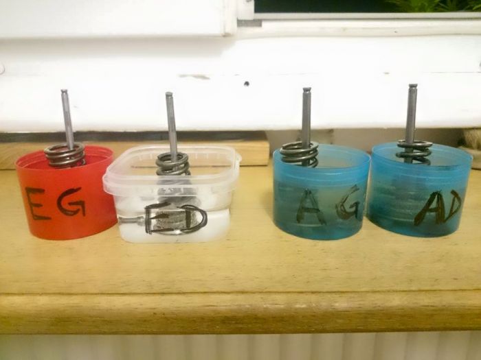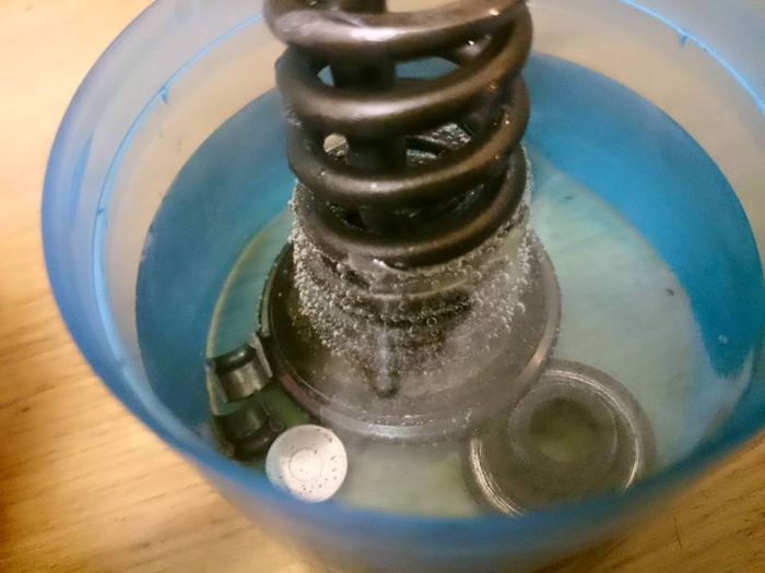 Les soupapes repérées, elles ont baigné avec les ressorts, coupelles et les demi-lunes pendant deux jours et deux nuits dans le vinaigre blanc, à 0.60e le litre, il ne faut pas s'en priver car ça fonctionne super, et ça économise du temps de frottage à la main.