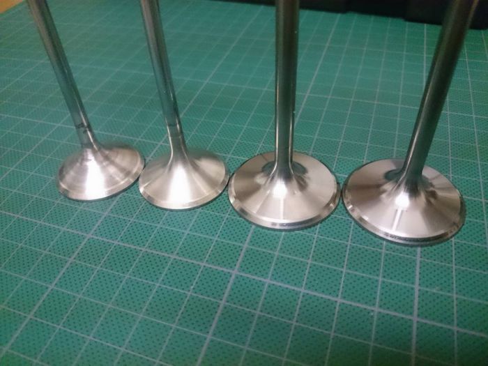 L'état des soupapes après nettoyage, avec un peu d'insistance sur la calamine coriace des soupapes échappement.