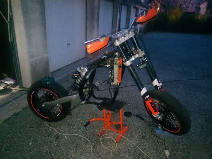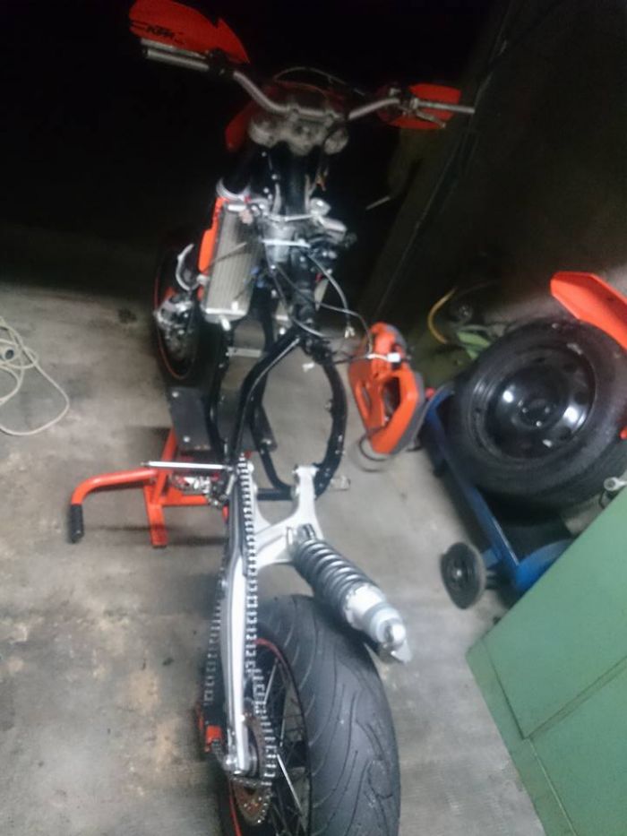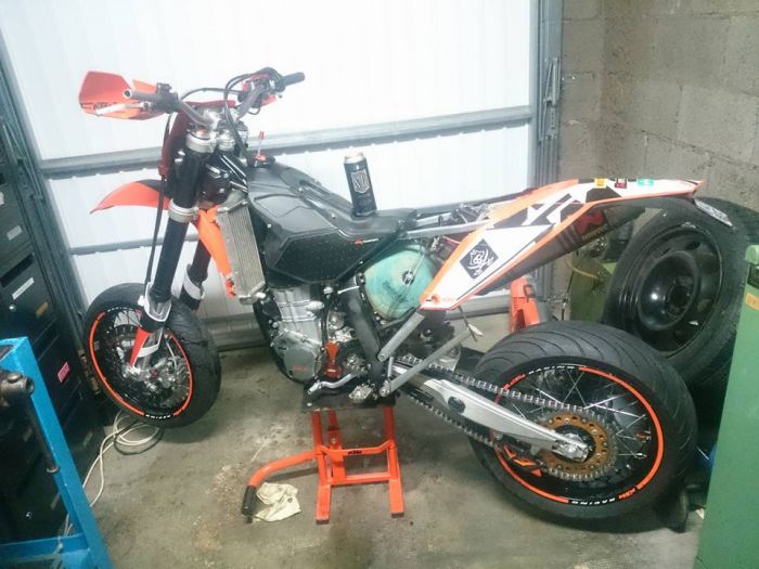 Elle a été transformée SM en 2011/2012, les factures ne remontant pas plus haut, et comme ça tournait très fort je l’ai achetée comme ça, et dans les mois qui ont suivi, préparé une série de pièces pour retaper (préventivement) le moteur complet à 200h chrono, sauf en cas d'une casse qui m’aurait valu une ablation de la carte bleue !