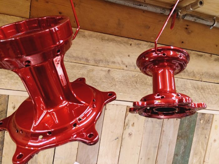 En attendant le montage des jantes, voici une photo des moyeux sablé puis poudré en rouge candy.