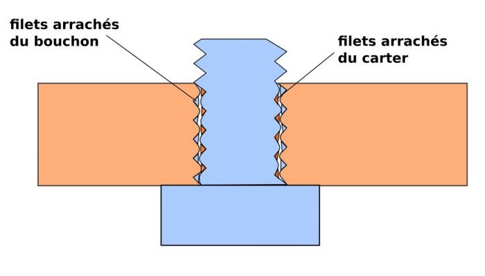 Si le bouchon est plus long que le logement dans le carter Du coup, la partie dépassante dans la boite n'est pas abimée, alors que les filets dans le carter et ceux du bouchon s’entremêlent.