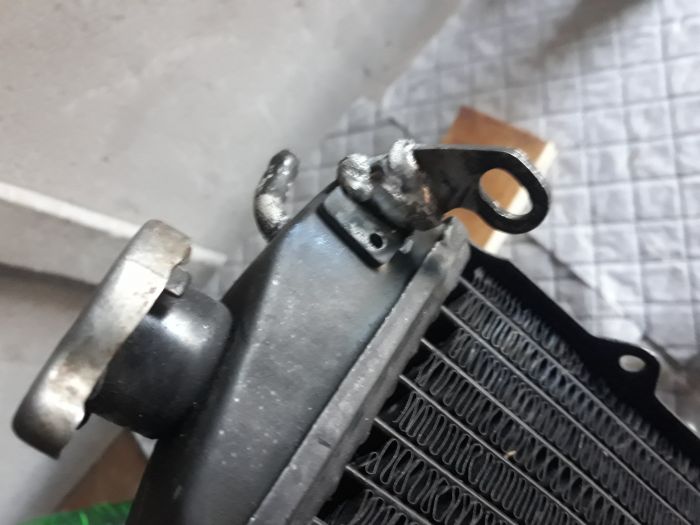 Le radiateur droit avait une patte de fixation cassée en plus de celle dont il manque un morceau, la cassée est désormais ressoudée (pas beau mais fonctionnel).