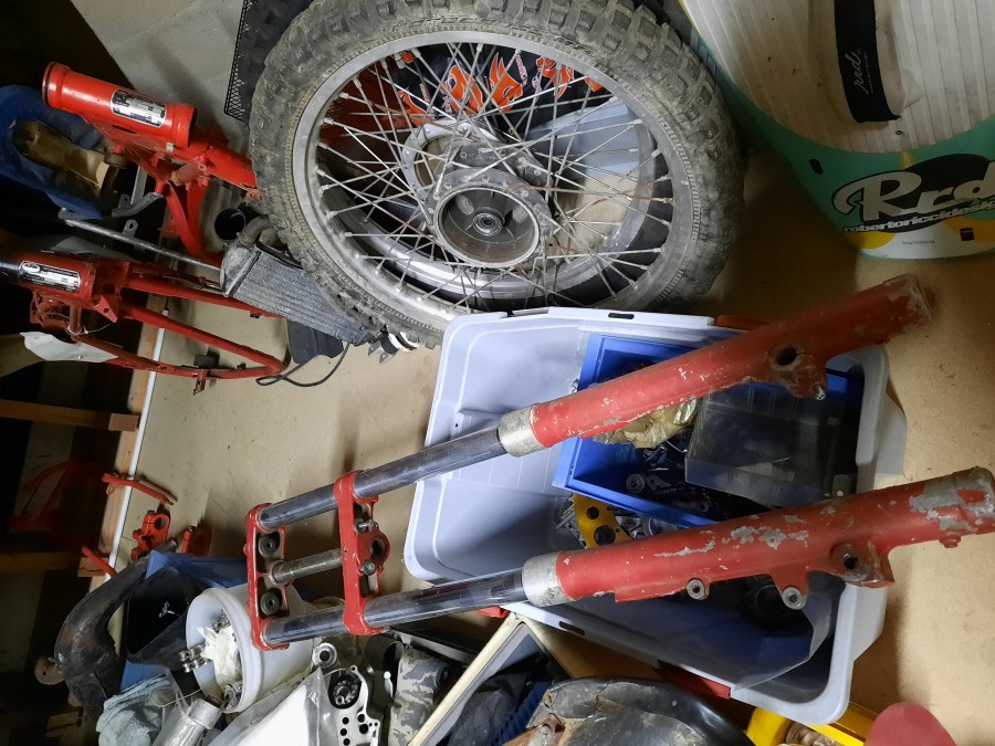 Vu la couleur rouge c'est une fourche d'aprilia MX ou RX de 83 (j'en ai eu une en 2009 ) identique a celle qu'on peut trouver sur une ktm de ce millésime qui avait aussi l'option disque Brembo . C 'est devenue aussi rare que le modéle a tambour ...