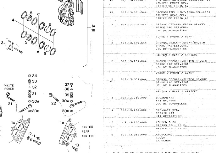 Pas facile de trouver des pièces... j’ai dégrippé et nettoyé les étriers (structure ok), les pistons sont ok, mais bloquent dans les étriers ktm. Les joints de piston ont sans doute un peu gonflé. Pas de kit de restauration disponible, donc il faut innover...