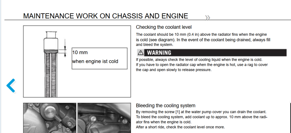 Au retour, après avoir laissé refroidir la bécane, j'ai vérifié à nouveau le niveau qui était comme au début, en dessous du haut des éléments du radiateur.