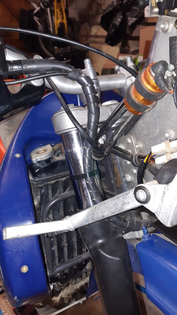 Pour la durite, je dirais qu'elle ne doit pas être solidaire du protège fourche. Pourquoi est-elle doublée de scotch ? Elle est liée au câble du capteur de vitesse ?
