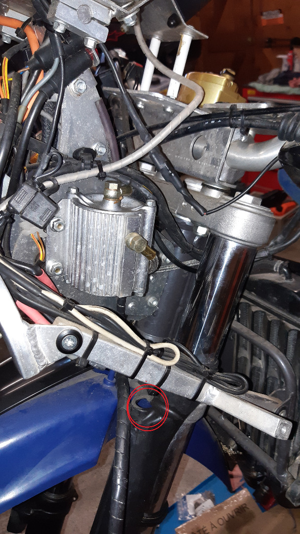 Est ce que la durite de frein doit passer dans le trou du protège fourche, on dirait que c'est fait pour mais j'ai peur que ça frotte sur le tube de fourche !!! Photo de l'ancien passage de durite, maintenant elle passe de façon classique au dessus du guidon, mais malheureusement elle a tendance a garder son ancienne forme  :/