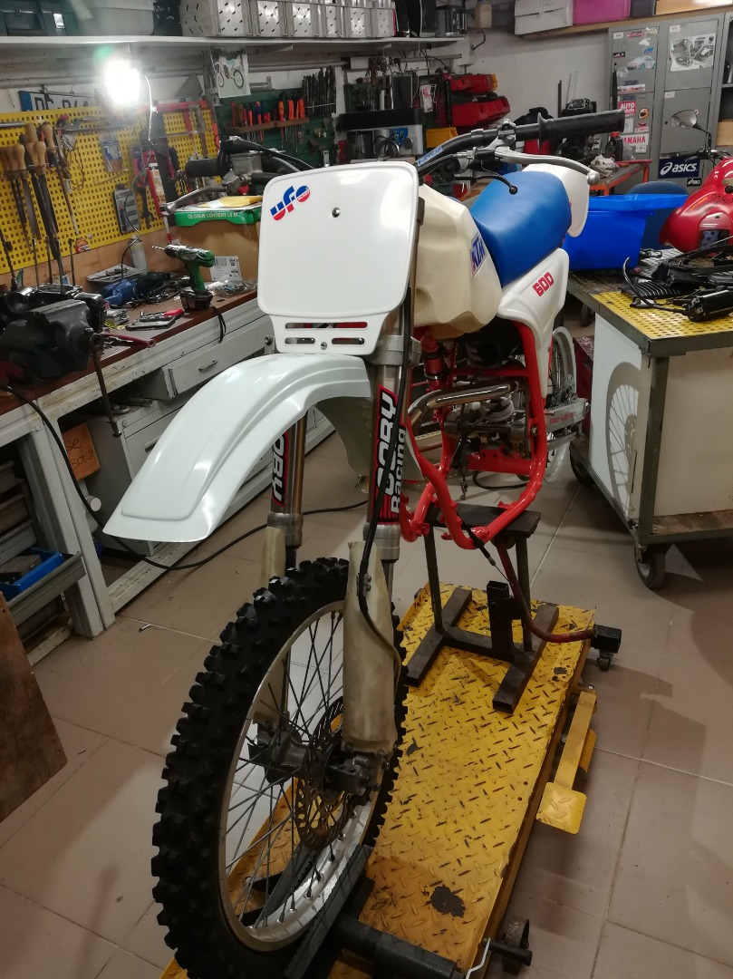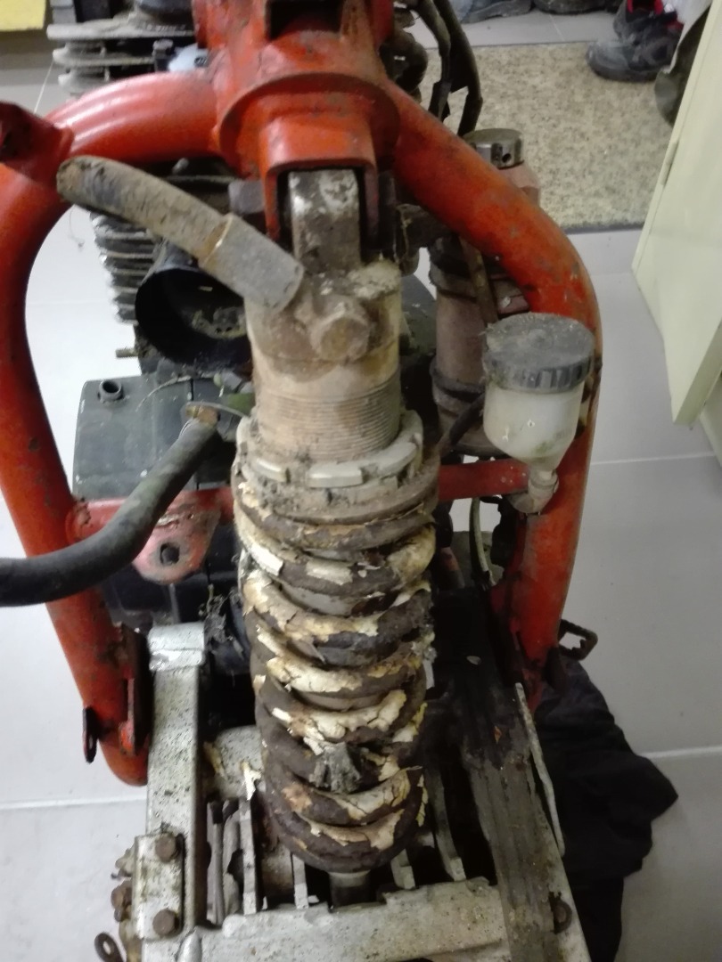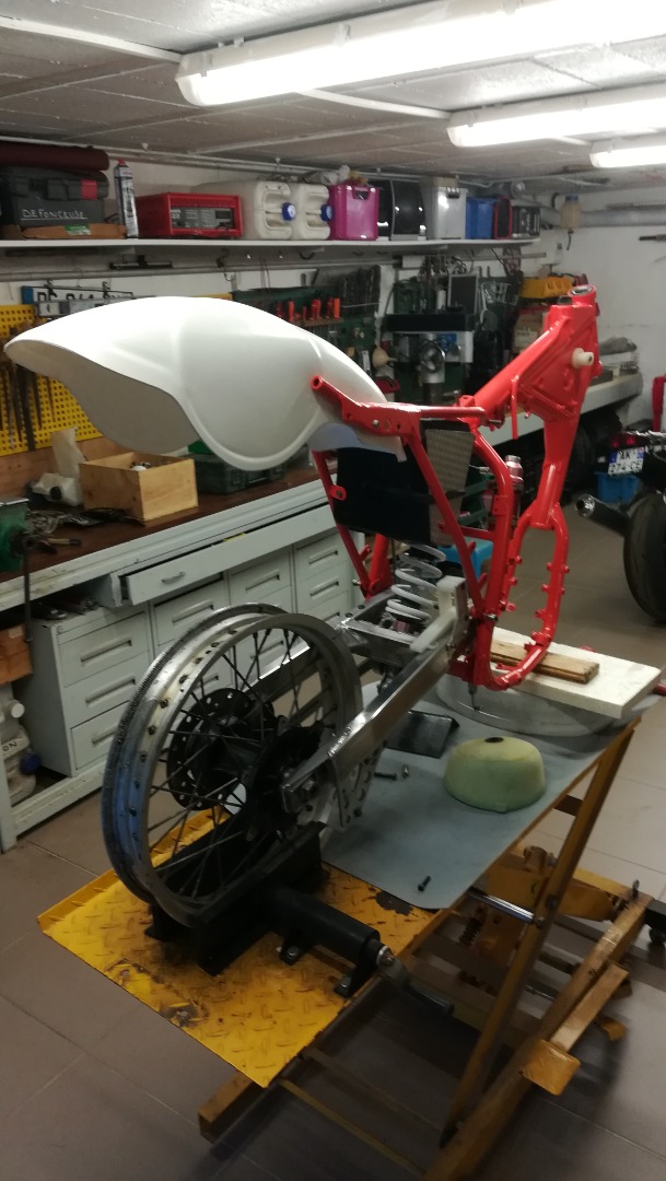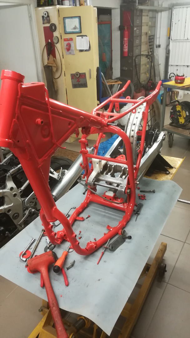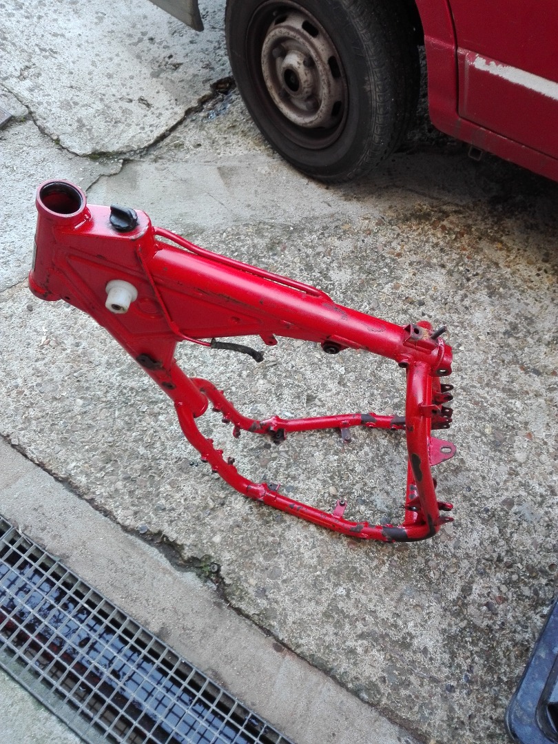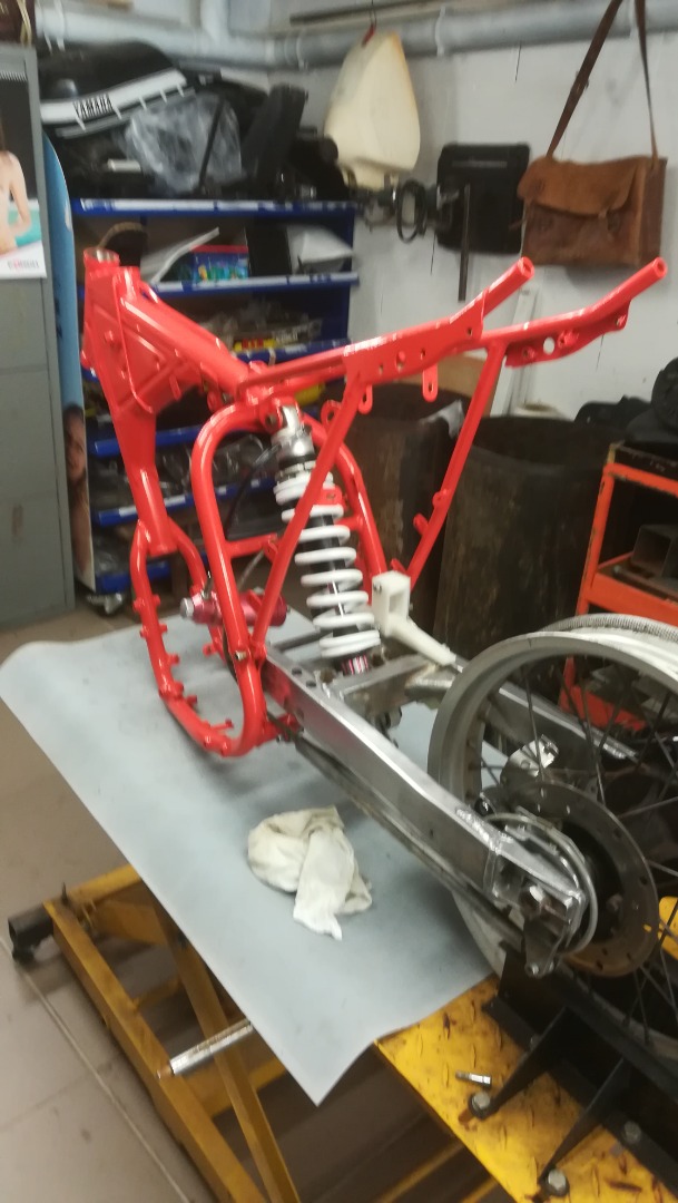 suite restauration soudage butée de té sur la colonne pour la fourche de 250kx peinture epoxy cadre ral2002 achat garde boue av/ ar cross et cache latéraux ancien modèle que je trouve plus sympa réfection de l'amortisseur réfection de la selle