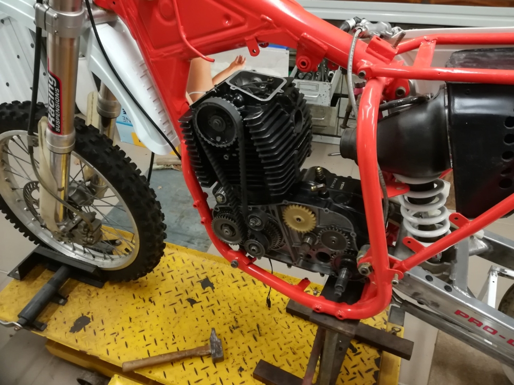 pour bénéficier du démarreur électrique montage du moteur 600 pegaso après modification des entretoises du carter moteur car axe bras oscillant plus gros sur le ktm remplacement du collecteur d'échappement par un inox acheté sur ebay pour la suite démontage du carburateur ktm pour nettoyage en profondeur et mise en place du circuit électrique avec mini batterie type solise et adaptation silencieux de 450rmz et après test démarrage