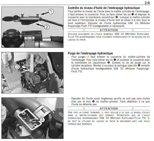 Contrairement aux circuits de freinage, ces commandes d'embrayage hydraulique sont fastidieuses à purger. Effectivement il ne faut absolument pas y laisser entrer de l'air, sinon il faut un paquet de shadocks !
