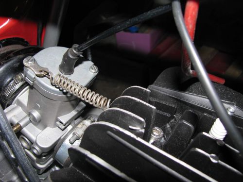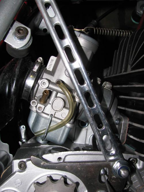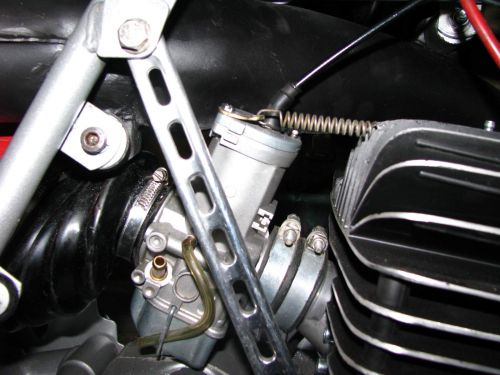 et le fin du fin, dremelisation du carter moteur afin que le dessous du carbu ne vienne pas toucher ET....petite modif que j'avais vue à l'époque sur des motos d'usine afin que le carbu n'entre pas en vibration et touche malgré tout le carter au dessous à certains régimes, créant ainsi une perturbation du flotteur et une émulsion malsaine pour la régularité de fonctionnement...un flanc de maillon de chaine sous une des vis de chapeau de carbu et un ressort mettant légèrement le carbu en tension et amortissant les vibrations....