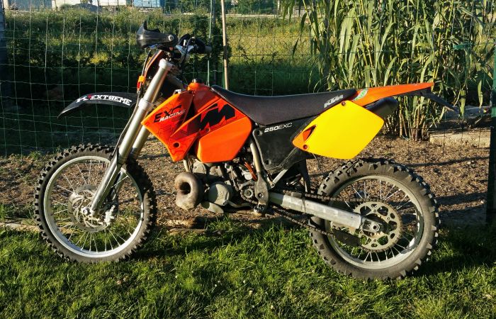 Et donc, voici la machine, une KTM 250 EXC de 2003 que je suis en train d'essayer de bien régler (je n'y connais pas grand chose aux 2T encore)