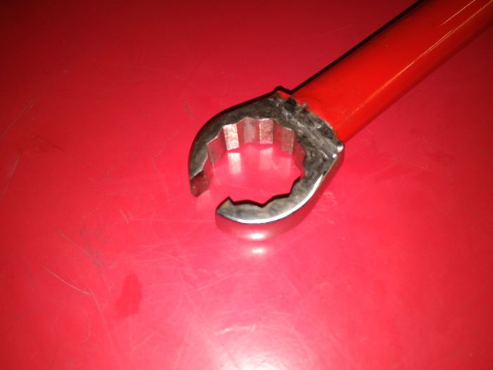 Pour éviter d'abîmer les pans de l'écrou, j'ai fais une clé. Une clé à œil refendu, un morceau de tube costaud et une poignée.  🙂  Ça va tout seul  😎