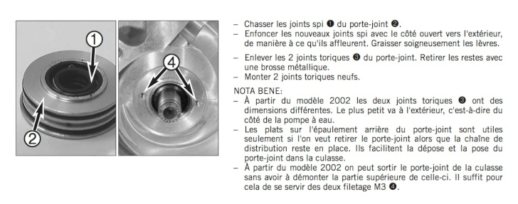 apres une fuite de liquide de refroidissement au niveau du fameux trou sur le coté de la culasse , j ai alors deposé le carter de pompe a eau ainsi que la pompe a eau et je suis tomber sur une " rondelle " appelé support de joint spy sur les microfiches sur la quelle il y a deux joints torique et a l intérieur il y a deux joint spi , j ai l impression que les deux spy sont a l envers !!! avez vous des photos de cette pièce avec les joints spy monté pour comparer avec le montage actuel , merci