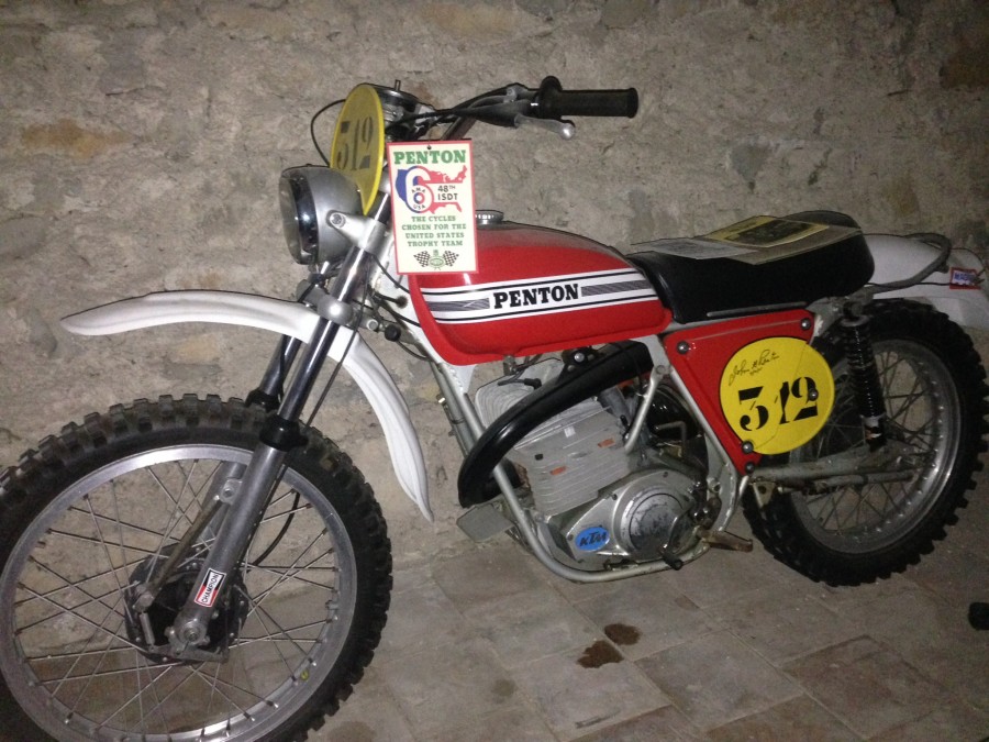 Une petite histoire qui a sa place ici. Je suis originaire de l'Aube et j'habite en Californie. Il y a quelques mois, j'ai achete un lot de 3 motos, 2 hva et une Penton 250 74. J'hesitais a l'envoyer en France et la mettre en vente et puis je me suis dit que j'allais la garder quelques temps. Les mois passent et un dimanche je fais de la moto avec mes amis. L'un d'eux me dit qu'un de ses clients a une belle collection d'anciennes et que dimanche prochain, il organise un breakfast avec John Penton en invite d'honneur. "Est ce que tu veux venir?" qu'il me demande. Oui pourquoi pas je ferai signer la Penton. Il fallait que je m'affole, meme si je voulais la garder dans son jus, il lui faut coup de peinture sur les caches lateraux et reservoir. C'est fait durant la semaine et Mr John Penton peut signer un cache latéral le dimanche.