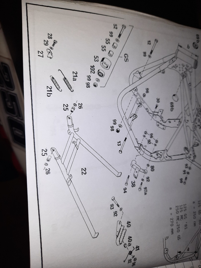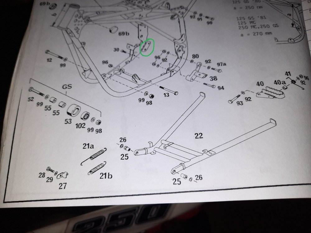 Je n'ai pas cette bécane, mais le fonctionnement des béquilles est souvent le même. Je pense que la patte va sur l'un des trous entourés en vert.