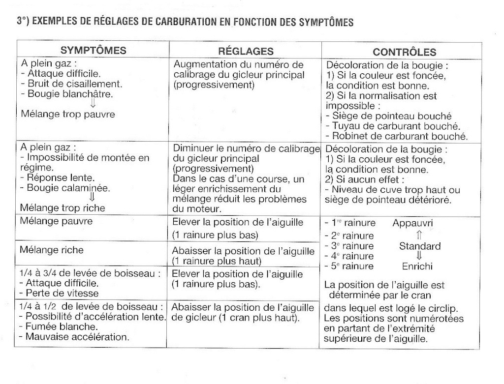 Il manque la hauteur du niveau de cuve, la taille de la coupe du boisseau ( chiffre sous le boisseau), le type de bougie et l'état de l'allumage sous le carter.