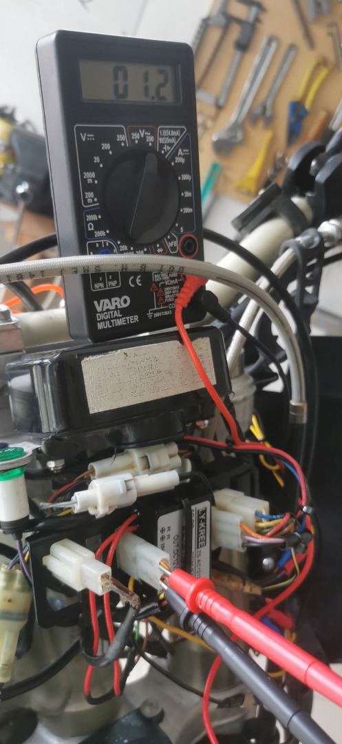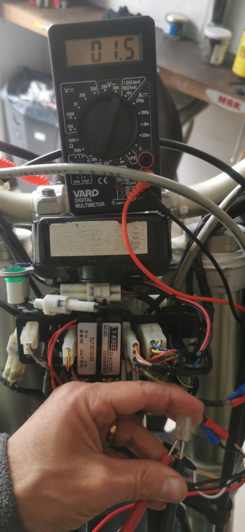 Résultats, une fois remis en place, la moto sort bien 14volts à la sortie des clignotants, klaxon et phares.  👍