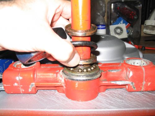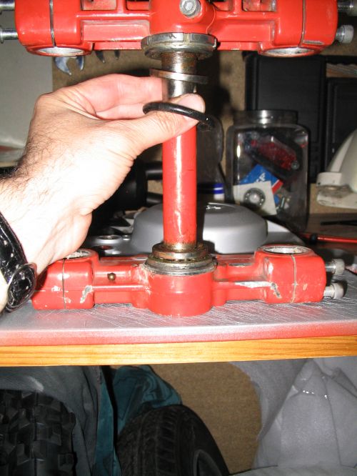 je viens de commencer le remontage de ma 250 GS 77, mais je rencontre déjà un obstacle: il semble qu'il manque les cuvettes de roulements de direction, celles serties dans le cadre (colonne de direction). Ceux qui ont une KTM à fourche Cériani peuvent ils me dire si effectivement il y a une cuvette sertie à chaque extrémité de la colonne, ou juste à la partie supérieure? Car le part list n'est pas clair sur le sujet, et on dirait que le chemin de billes est intégré au cadre dans la partie inférieure.
