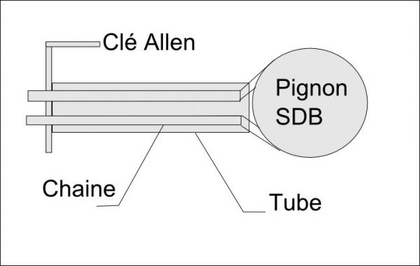 Tu peux bloquer le pignon de sortie de boite avec une clé à chaine "home made". Un tube assez gros pour que deux brins de chaine puissent passer à l'intérieur, une clé allen glissée entre deux maillons, le tour est joué.