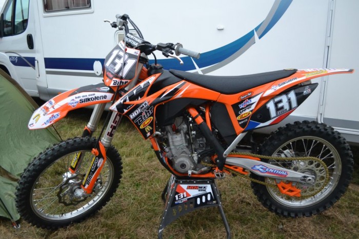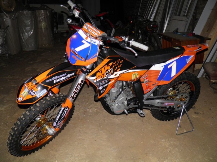 Ancienne moto à Nicolas aubin : numéro 131 Aubin , moteur injection , kit déco ktm HDI , fonds de plaques N°131 AUBIN , mousse de guidon Renthal noir , ils sont partient sans filtre à air dessus , jantes origine excel grises , ligne FMF power bomb , fourches préparées , amortisseur à biellette wp trax , bloc cdi usine , radiateur sxs , auto-collants Hdi sur les fourches , guide chaine orange , sabot moteur en carbonne , protège garde-boue avant en carbonne , fil anti-parasite rouge , compteur d' heures placé au niveau du bras-oscillant et de l' amortisseur normalement posé à l' avant de la moto au niveau du cadre mais pas pour la mienne ( donc à l'arrière ) , moteur de course préparé usine .