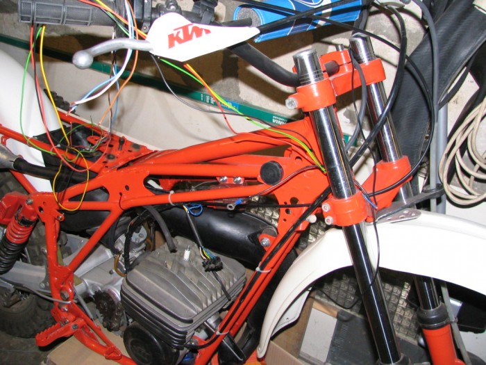 Je n'ai jamais vu cette pièce sur des KTM d'époque, usine ou série, et n'en ai trouvé aucune trace dans les photos d'archive. ( Les pièces usine ou Farioli étaient des bras d'origine allégés par percage ).