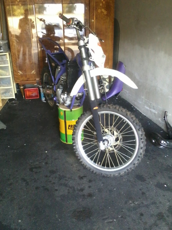 voila je me suis fais un petit plaisir c'est ma première enduro 300 ktm de janvier 95 sur la carte grise donc je pence que c'est un model 94 a confirmer voila elle n'a pas tourné depuis 1 ans et demi donc grosse révision a prévoir le vendeur m'a dit que l'embrayage patiné donc disque a changer est une crevaison a réparer après surprise en démontant!!! il a peint les carénage a la bombe ça s’écaille ça fais dégueulasse et il a couper tous le faisceaux électrique (phare,feux,cligno,feux stop,klaxon,ect)