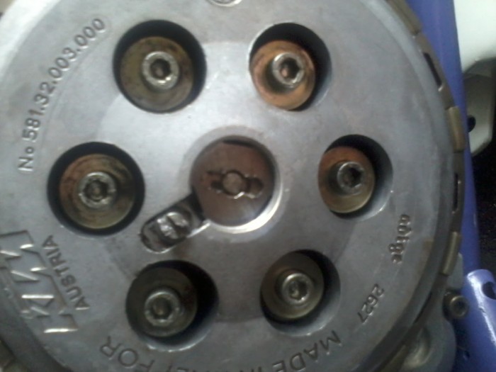 Pour tenir les ressorts c'est un bout de tole percé qui vient sur ces vis en contre-bas,ça donner quoi l'embrayage avant de changer les disques,les disques etaient vraiment morts ou peu etre l'huile de boite inadequoit "600ml",est-ce bien sec dans ton carter d'allumage?Peu etre la tringlerie usée à voir!