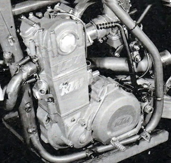 Si je me souviens bien , le 1er prototype avait été développé sur la base bas moteur du 500 2 temps , ce que tend a prouver la photo : le sélecteur et le kick ne sont pas sur le même axe , ce qui fut pourtant le cas sur la série . Pour le haut moteur , à part l'absence d'ailettes de refroidissement , c'est déjà très ressemblant .